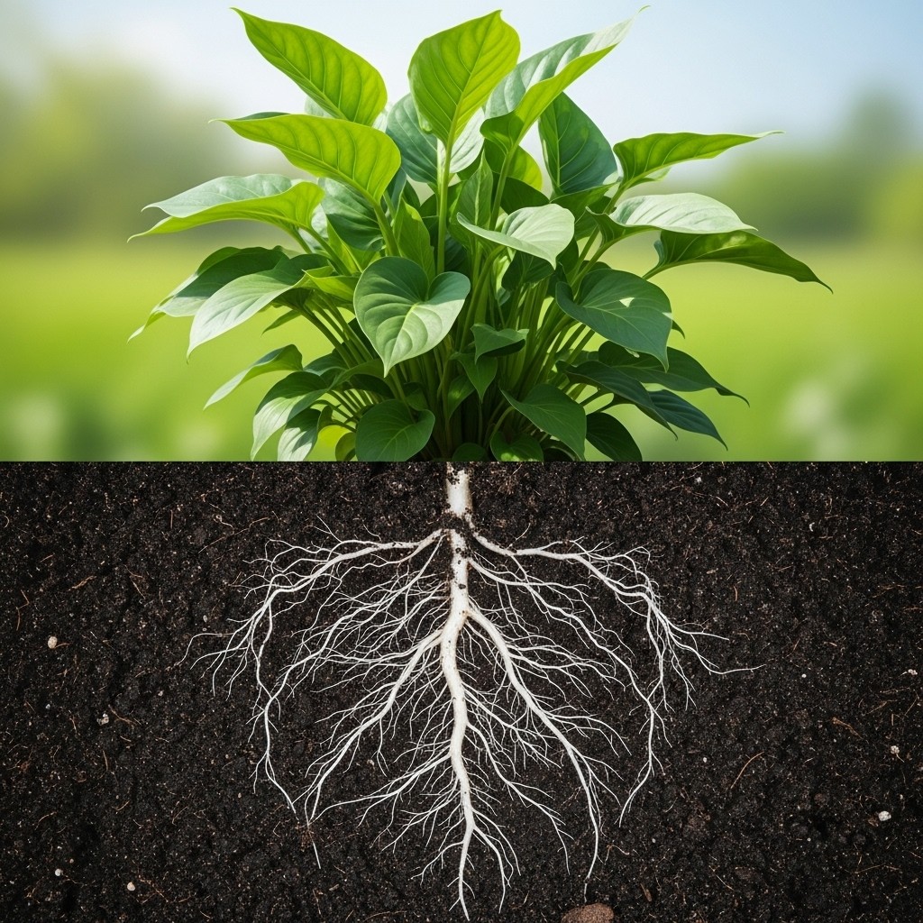 ฮิวมิคแอซิดเข้มข้น: “ผู้จัดการธาตุอาหารและยากระตุ้นราก” ฮิวมิคแอซิดจะเข้าไปปลดล็อกธาตุอาหารที่ถูกตรึงในดิน ให้อยู่ในรูปที่พืชดูดซึมได้ง่าย และยังเป็นสารกระตุ้นธรรมชาติที่ส่งเสริมการแตกรากฝอยใหม่ ทำให้รากพืชแข็งแรงและดูดซึมสารอาหารได้เต็มประสิทธิภาพ